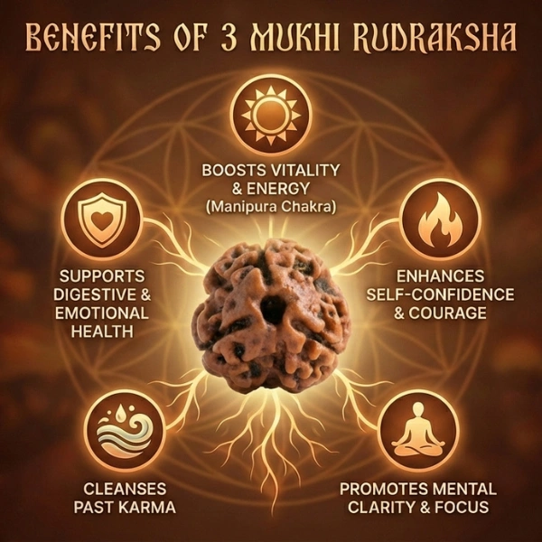 The 3 Mukhi eliminates negativity, increases courage, improves self-esteem, and supports spiritual awakening.